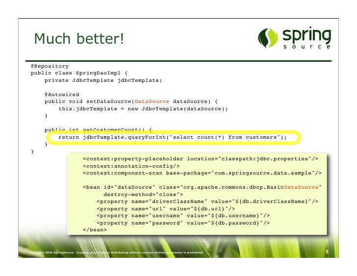 90. CMT, JdbcTemplate and connection pools forum.springsource.orgCMT, JdbcTemplate and connection pools I am using JdbcTemplate in a very simple fashion, basically to do mass updates within a session bean's method. I have no configuration for any Spring .. |
